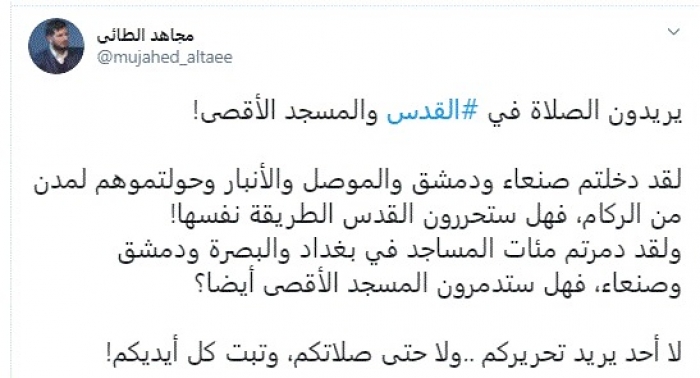 وقال في تغريدة عبر "تويتر" رصدها "المشهد العربي": "يريدون الصلاة في القدس والمسجد الأقصى! لقد دخلتم صنعاء ودمشق والموصل والأنبار وحولتموهم لمدن من الركام، فهل ستحررون القدس الطريقة نفسها".