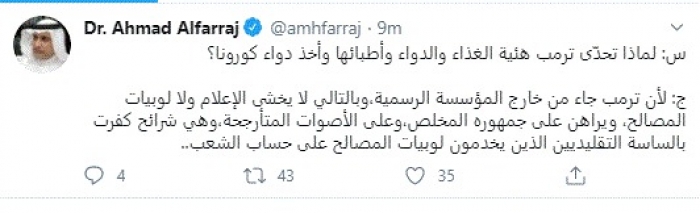 وقال في تغريدة عبر "تويتر" رصدها "المشهد العربي": "لماذا تحدّى ترمب هئية الغذاء والدواء وأطبائها وأخذ دواء كورونا؟ لأن ترمب جاء من خارج المؤسسة الرسمية".