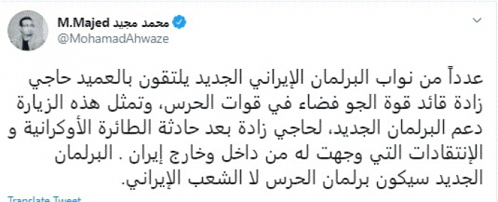 وكتب في تغريدة عبر "تويتر" رصدها "المشهد العربي": "عدداً من نواب البرلمان الإيراني الجديد يلتقون بالعميد حاجي زادة قائد قوة الجو فضاء في قوات الحرس، وتمثل هذه الزيارة دعم البرلمان الجديد".