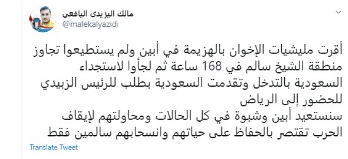 وقال في تغريدة عبر "تويتر" رصدها "المشهد العربي": "أقرت مليشيات الإخوان بالهزيمة في أبين ولم يستطيعوا تجاوز منطقة الشيخ سالم في 168 ساعة".