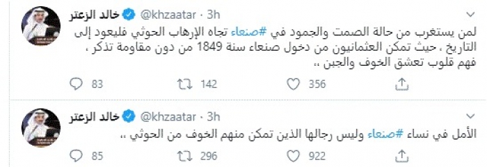 وأضاف في تغريدة أخرى: "لمن يستغرب من حالة الصمت والجمود في صنعاء تجاه الإرهاب الحوثي فليعود إلى التاريخ، حيث تمكن العثمانيون من دخول صنعاء سنة 1849 من دون مقاومة تذكر، فهم قلوب تعشق الخوف والجبن".
