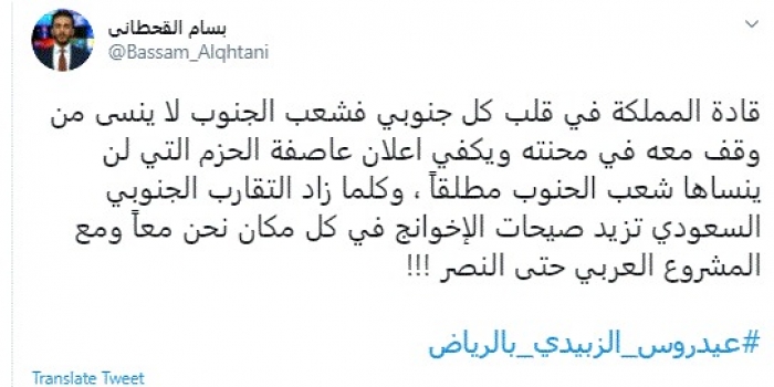وكتب في تغريدة عبر "تويتر" رصدها "المشهد العربي": "قادة المملكة في قلب كل جنوبي فشعب الجنوب لا ينسى من وقف معه في محنته ويكفي إعلان عاصفة الحزم التي لن ينساها شعب الحنوب مطلقاً".
