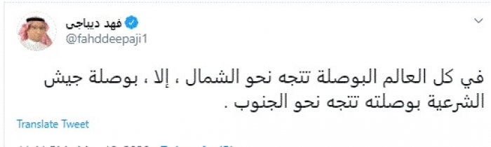 وقال في تغريدة عبر "تويتر" رصدها "المشهد العربي": "في كل العالم البوصلة تتجه نحو الشمال ، إلا ، بوصلة جيش الشرعية بوصلته تتجه نحو الجنوب".