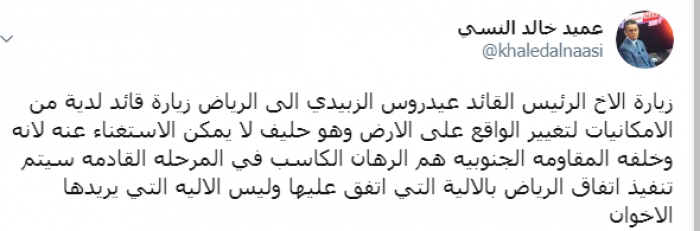 وكتب النسي عبر تغريدة له على "تويتر" رصدها " المشهد العربي": "زيارة الأخ الرئيس القائد عيدروس الزُبيدي إلى الرياض زيارة قائد لديه من الإمكانيات لتغيير الواقع على الأرض وهو حليف لا يمكن الاستغناء عنه لأنه وخلفه المقاومة الجنوبية هم الرهان الكاسب في المرحلة القادمة".