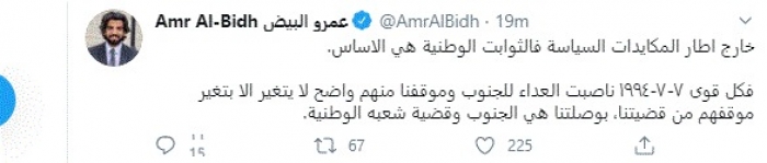 وكتب في تغريدة عبر "تويتر" رصدها "المشهد العربي": "خارج إطار المكايدات السياسة فالثوابت الوطنية هي الأساس".