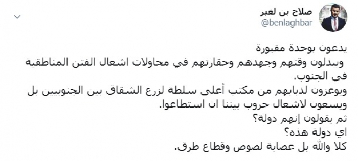 وكتب بن لغبر عبر تغريدة له على "تويتر" رصدها " المشهد العربي" :"يدعون بوحدة مقبورة، ويبذلون وقتهم وجهدهم وحقارتهم في محاولات إشعال الفتن المناطقية في الجنوب".