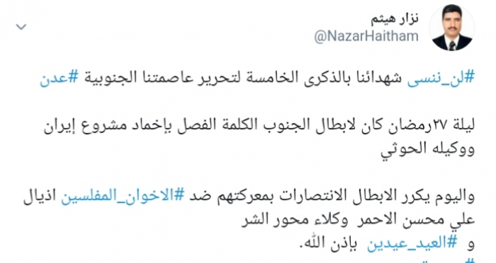 وكتب هيثم عبر تغريدة له على "تويتر" رصدها " المشهد العربي": "لن ننسى شهدائنا بالذكرى الخامسة لتحرير عاصمتنا الجنوبية عدن".