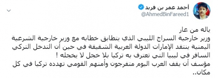 وكتب بن فريد عبر تغريدة له على "تويتر" رصدها " المشهد العربي" :"ياله من عار، وزير خارجية السراج الليبي الذي يتطابق خطابه مع وزير خارجية الشرعية اليمنية ينتقد الإمارات الدولة العربية الشقيقة في حين أن التدخل التركي السافر في ليبيا التي تعترف به تركيا بلا خجل لا يخجله".