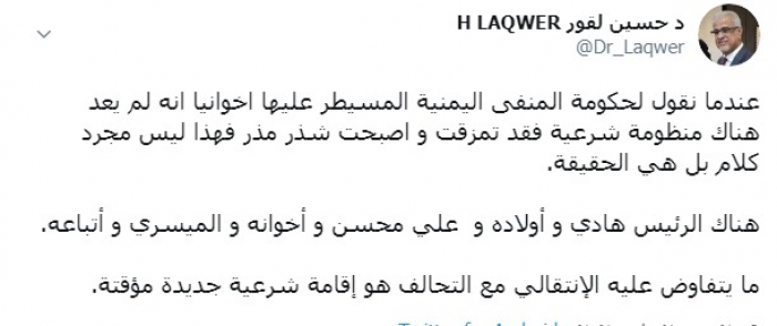 وكتب لقور عبر تغريدة له على "تويتر" رصدها " المشهد العربي": "عندما نقول لحكومة المنفى اليمنية المسيطر عليها إخوانيا أنه لم يعد هناك منظومة شرعية فقد تمزقت و أصبحت شذر مذر فهذا ليس مجرد كلام بل هي الحقيقة".