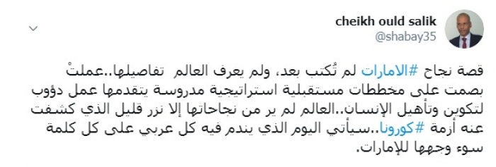 وأضاف:" العالم لم ير من نجاحاتها إلا نزر قليل الذي كشفت عنه أزمة كورونا، سيأتي اليوم الذي يندم فيه كل عربي على كل كلمة سوء وجهها للإمارات".