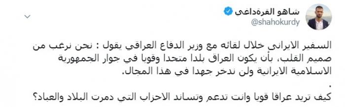وكتب عبر تغريدة له على "تويتر" رصدها " المشهد العربي" :" السفیر الإیرانی خلال لقائه مع وزير الدفاع العراقي يقول : نحن نرغب من صميم القلب، بأن يكون العراق بلدا متحدا وقويا في جوار الجمهورية الإسلامية الإيرانية ولن ندخر جهدا في هذا المجال".