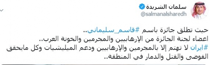 وكتب الشريدة عبر تغريدة له على "تويتر" رصدها " المشهد العربي": "حيث تطلق جائزة باسم قاسم سليماني، أعضاء لجنة الجائزة من الإرهابيين والمجرمين والخونة العرب".