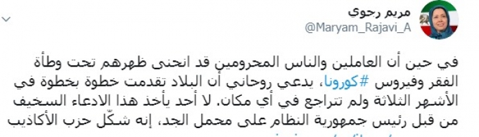 وكتبت رجوي عبر تغريدة لها على "تويتر" رصدها " المشهد العربي":" في حين أن العاملين والناس المحرومين قد انحنى ظهرهم تحت وطأة الفقر وفيروس كورونا، يدعي روحاني أن البلاد تقدمت خطوة بخطوة في الأشهر الثلاثة ولم تتراجع في أي مكان".
