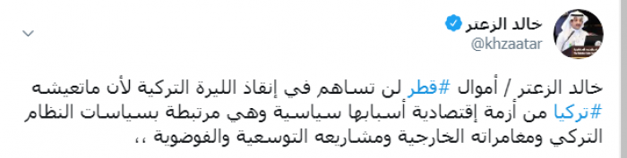 وكتب الزعتر عبر تغريدة له على "تويتر" رصدها " المشهد العربي":" أموال قطر لن تساهم في إنقاذ الليرة التركية لأن ما تعيشه تركيا من أزمة اقتصادية أسبابها سياسية وهي مرتبطة بسياسات النظام التركي ومغامراته الخارجية ومشاريعه التوسعية والفوضوية".