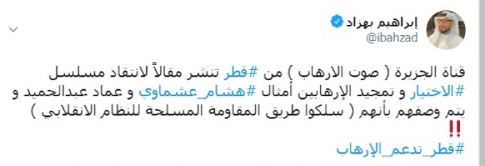 وكتب بهزاد عبر تغريدة له على "تويتر" رصدها " المشهد العربي":"قناة الجزيرة ( صوت الإرهاب ) من قطر تنشر مقالاً لانتقاد مسلسل الاختيار و تمجيد الإرهابين أمثال هشام عشماوي و عماد عبدالحميد و يتم وصفهم بأنهم ( سلكوا طريق المقاومة المسلحة للنظام الانقلابي).
