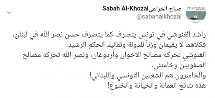 وكتب الخزاعي عبر تغريدة له على "تويتر" رصدها "المشهد العربي":"راشد الغنوشي في تونس يتصرّف كما يتصرّف حسن نصر الله في لبنان، فكلاهما لا يقيمان وزناً للدولة وتقاليد الحكم الرشيد".