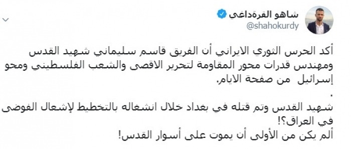 وأضاف: "شهيد القدس وتم قتله في بغداد خلال انشغاله بالتخطيط لإشعال الفوضى في العراق؟! ألم يكن من الأولى أن يموت على أسوار القدس".