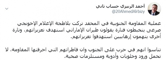 وكتب الربيزي عبر تغريدة له على "تويتر" رصدها " المشهد العربي":"عملية المقاومة الجنوبية في المحفد تركت بلاطجة الإعلام الإخونجي صرعى يتخبطون فتارة يقولون طيران الإماراتي استهدف تعزيزاتهم، وتارة أخرى يتهمون إرهابيين استهدفوا تعزيزاتهم".