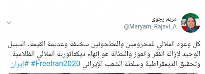 وكتبت رجوي عبر تغريدة لها على "تويتر" رصدها "المشهد العربي":"وعود الملالي للمحرومين والمطحونين سخيفة وعديمة القيمة، السبيل الوحيد لإزالة الفقر والعوز والبطالة هو إنهاء ديكتاتورية الملالي الظلامية وتحقيق الديمقراطية وسلطة الشعب الإيراني ".