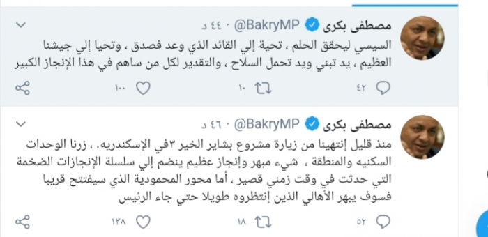 وكتب بكري عبر تغريدة له على "تويتر" رصدها " المشهد العربي": "منذ قليل انتهينا من زيارة مشروع بشاير الخير ٣في الإسكندرية ، زرنا الوحدات السكنية والمنطقة ، شيء مبهر وإنجاز عظيم ينضم إلى سلسلة الإنجازات الضخمة التي حدثت في وقت زمني قصير ، أما محور المحمودية الذي سيفتتح قريبا فسوف يبهر الأهالي الذين انتظروه طويلا حتى جاء الرئيس السيسي ليحقق الحلم".