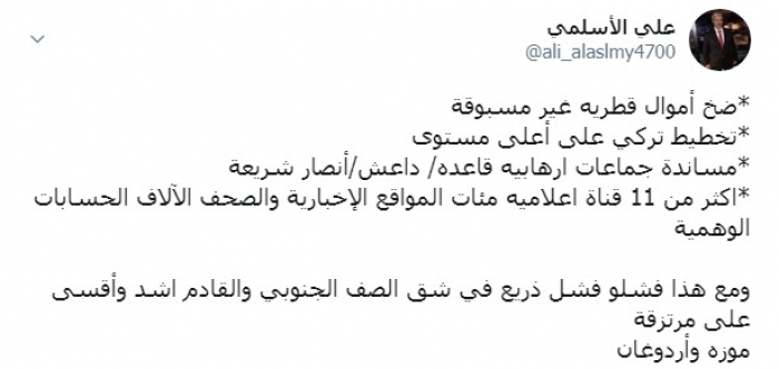 وكتب الأسلمي عبر تغريدة له على "تويتر" رصدها " المشهد العربي":"ضخ أموال قطرية غير مسبوقة، تخطيط تركي على أعلى مستوى، مساندة جماعات إرهابية قاعدة و داعش و أنصار شريعة، أكثر من 11 قناة إعلامية مئات المواقع الإخبارية والصحف الآلاف الحسابات الوهمية ".