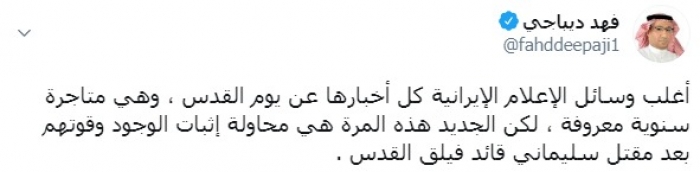 وكتب ديباجي عبر تغريدة له على "تويتر" رصدها " المشهد العربي":"أغلب وسائل الإعلام الإيرانية كل أخبارها عن يوم القدس ، وهي متاجرة سنوية معروفة ، لكن الجديد هذه المرة هي محاولة إثبات الوجود وقوتهم بعد مقتل سليماني قائد فيلق القدس" .