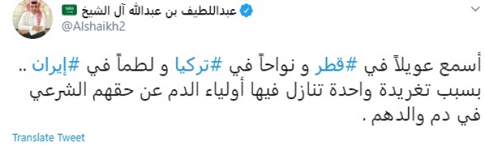 وكتب في تغريدة عبر "تويتر" رصدها "المشهد العربي": "أسمع عويلاً في قطر ونواحاً في تركيا ولطماً في إيران.. بسبب تغريدة واحدة تنازل فيها أولياء الدم عن حقهم الشرعي في دم والدهم".