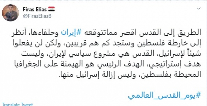 قال الباحث السياسي العراقي فراس إلياس، اليوم، إن القدس مشروع سياسي لإيران وليست هدف استراتيجي.