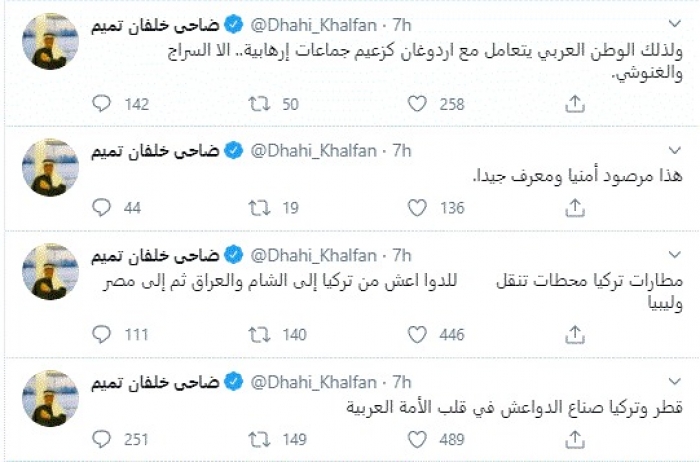 وكتب في تغريدات عبر "تويتر" رصدها "المشهد العربي": "قطر وتركيا صناع الدواعش في قلب الأمة العربية. مطارات تركيا محطات تنقل للدواعش من تركيا إلى الشام والعراق ثم إلى مصر وليبيا هذا مرصود أمنيا ومعرف جيدا".