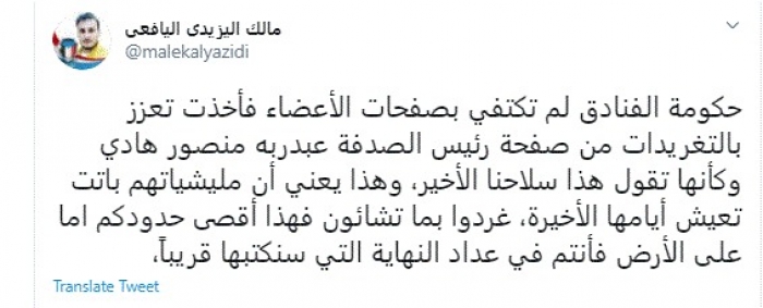 وكتب في تغريدة عبر "تويتر" رصدها "المشهد العربي": "حكومة الفنادق لم تكتفي بصفحات الأعضاء فأخذت تعزز بالتغريدات من صفحة رئيس الصدفة عبدربه منصور هادي وكأنها تقول هذا سلاحنا الأخير".
