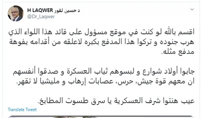 وقال في تغريدة عبر "تويتر" رصدها "المشهد العربي": "أقسم بالله لو كنت في موقع مسؤول على قائد هذا اللواء الذي هرب جنوده و تركوا هذا المدفع بكبره لأعلقه من أقدامه بفوهة مدفع مثله".
