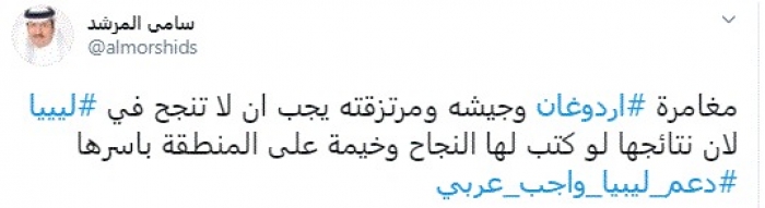 وقال في تغريدة عبر "تويتر" رصدها "المشهد العربي": "مغامرة أردوغان وجيشه ومرتزقته يجب أن لا تنجح في ليييا لأن نتائجها لو كتب لها النجاح وخيمة على المنطقة بأسرها دعم ليبيا واجب عربي".