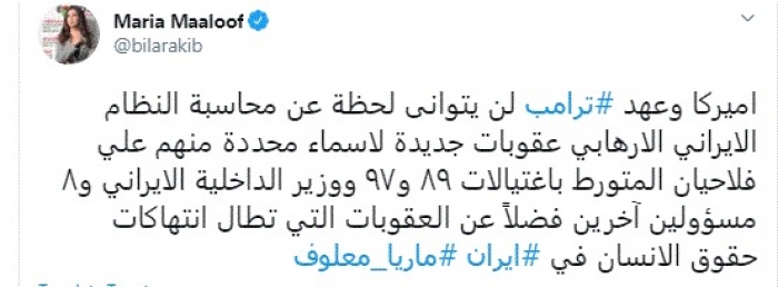 قالت الإعلامية اللبنانية ماريا معلوف، اليوم، إن الرئيس الأمريكي دونالد ترامب لن يتوانى لحظة عن الاستمرار في محاسبة النظام الإيراني.