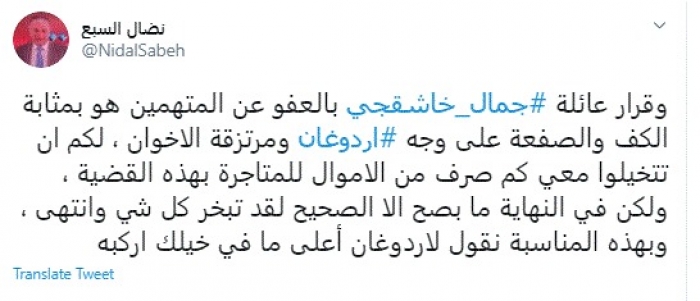 اعتبر المحلل السياسي اللبناني نضال السبع، اليوم، أن قرار عائلة خاشقجي بالعفو عن قتلته بمثابة صفعة على وجه الرئيس التركي رجب طيب أردوغان ومرتزقة الإخوان.