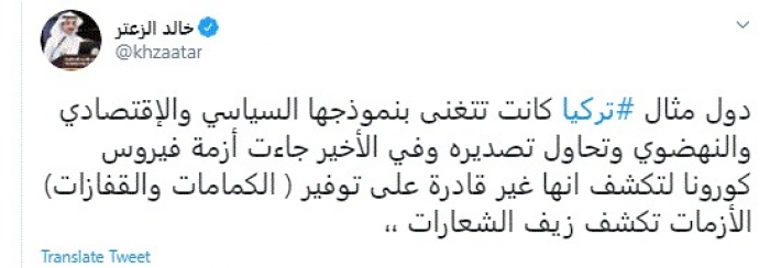 وكتب في تغريدة عبر "تويتر" رصدها "المشهد العربي": "دول مثال تركيا كانت تتغنى بنموذجها السياسي والاقتصادي والنهضوي وتحاول تصديره وفي الأخير جاءت أزمة فيروس كورونا لتكشف أنها غير قادرة على توفير ( الكمامات والقفازات) الأزمات تكشف زيف الشعارات".