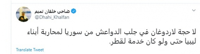 وقال في تغريدة عبر "تويتر" رصدها "المشهد العربي": "لا حجة لأردوغان في جلب الدواعش من سوريا لمحاربة أبناء ليبيا حتى ولو كان خدمة لقطر".