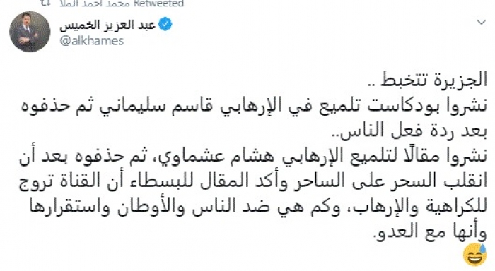 علق الإعلامي السعودي عبدالعزيز الخميس، اليوم، على تخبط قناة الجزيرة القطرية بنشرها لمواد إعلامية تروج لإرهابيين ثم تحذفها مرة أخرى، مشيرًا إلى أنها تروج للكراهية والإرهاب.