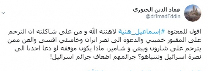 وكتب الجبوري عبر تغريدة له على "تويتر" رصدها " المشهد العربي": "أقول لـ...إسماعيل هنية لا هنئه الله و من على شاكلته أن الترحم على المقبور خميني والدعوة إلى نصر إيران وخامنئي أقسى وألعن ممن يترحم على شارون وبيغن و شامير، ماذا يكون موقفه لو دعى أحدنا إلى نصرة إسرائيل ونتنياهو؟".