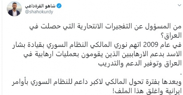 وأضاف: "في عام 2009 اتهم نوري المالكي النظام السوري بقيادة بشار الاسد بدعم الإرهاببين الذين يقومون بعمليات إرهابية في العراق وتوفير الدعم والتدريب".