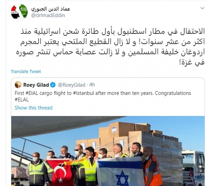 وقال في تغريدة عبر "تويتر" رصدها "المشهد العربي": "الاحتفال في مطار إسطنبول بأول طائرة شحن اسرائيلية منذ أكثر من عشر سنوات! و لا زال القطيع الملتحي يعتبر المجرم أردوغان خليفة المسلمين و لا زالت عصابة حماس تنشر صوره في غزة".