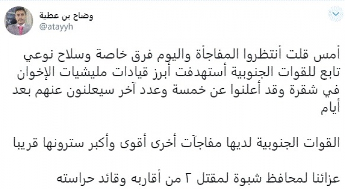وقال في تغريدة عبر "تويتر" رصدها "المشهد العربي": "أمس قلت انتظروا المفاجأة واليوم فرق خاصة وسلاح نوعي تابع للقوات الجنوبية استهدفت أبرز قيادات مليشيات الإخوان في شقرة وقد أعلنوا عن خمسة وعدد آخر سيعلنون عنهم بعد أيام".