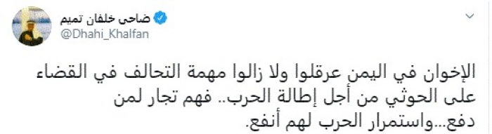 وقال في تغريدة عبر "تويتر" رصدها "المشهد العربي": "الإخوان في اليمن عرقلوا ولا زالوا مهمة التحالف في القضاء على الحوثي من أجل إطالة الحرب".