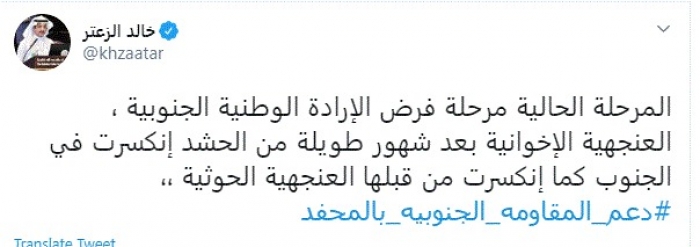 الزعتر: الجنوبيون كسروا العنجهية الإخوانية كما فعلوا مع الحوثيين
