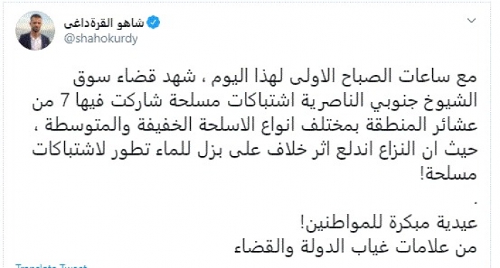 وقال في تغريدة عبر "تويتر" رصدها "المشهد العربي": "مع ساعات الصباح الاولی لهذا اليوم، شهد قضاء سوق الشيوخ جنوبي الناصرية اشتباكات مسلحة شاركت فيها 7 من عشائر المنطقة بمختلف أنواع الأسلحة الخفيفة والمتوسطة، حيث أن النزاع اندلع إثر خلاف على بزل للماء تطور لاشتباكات مسلحة".
