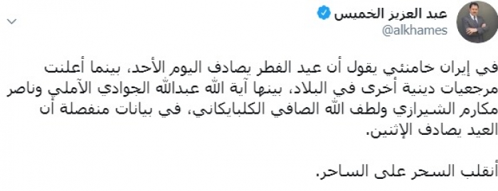 كشف الإعلامي السعودي، عبد العزيز الخميس، اليوم الأحد، عن خلافات إيرانية حول يوم عيد الفطر المبارك.