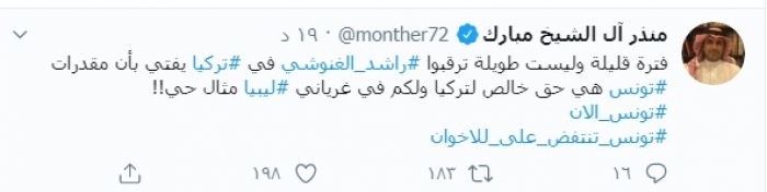 وكتب عبر تغريدة له على "تويتر" رصدها " المشهد العربي":"فترة قليلة وليست طويلة ترقبوا راشد الغنوشي في تركيا يفتي بأن مقدرات تونس هي حق خالص لتركيا ولكم في غرياني ليبيا مثال حي".