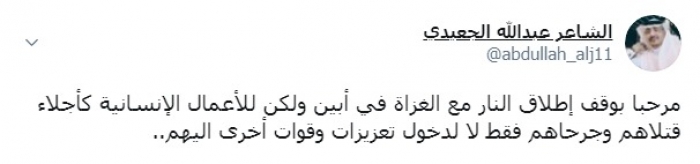 وكتب عبر تغريدة له على "تويتر" رصدها " المشهد العربي": "مرحبا بوقف إطلاق النار مع الغزاة في أبين ولكن للأعمال الإنسانية كأجلاء قتلاهم وجرحاهم فقط لا لدخول تعزيزات وقوات أخرى اليهم".