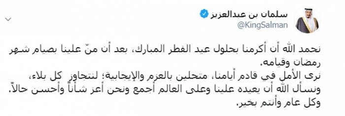 وكتب عبر تغريدة له على "تويتر" رصدها " المشهد العربي ":" نحمد الله أن أكرمنا بحلول عيد الفطر المبارك، بعد أن منّ علينا بصيام شهر رمضان وقيامه".