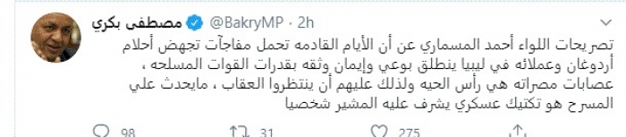 وقال في تغريدات عبر "تويتر" رصدها "المشهد العربي": "تصريحات اللواء أحمد المسماري عن أن الأيام القادمه تحمل مفاجآت تجهض أحلام أردوغان وعملائه في ليبيا ينطلق بوعي وإيمان وثقه بقدرات القوات المسلحة".