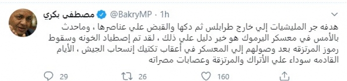 وأوضح: "وما حدث بالأمس في معسكر اليرموك هو خير دليل علي ذلك، لقد تم اصطياد الخونة وسقوط رموز المرتزقة بعد وصولهم إلى المعسكر في أعقاب تكتيك انسحاب الجيش، الأيام القادمة سوداء على الأتراك والمرتزقة وعصابات مصراتة".